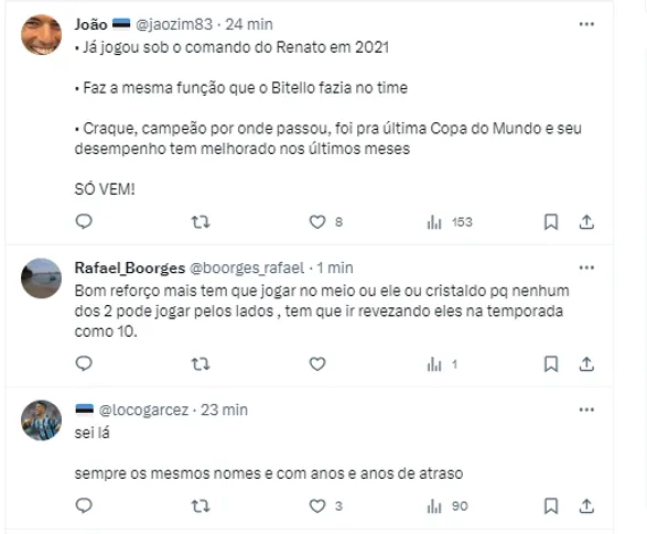 Além do Tricolor Gaúcho, outras equipes estão de olho no jogador, como é o caso de São Paulo e Botafogo, que também acompanham de perto a situação do meia de 34 anos.