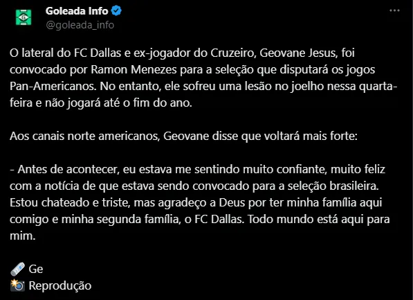 No entanto, a semana foi de fortes emoções para o ex-atleta do Cabuloso. Na terça-feira (12), ele recebeu uma ligação da CBF descobrindo que disputaria os Jogos Pan-Americanos de outubro. No entanto, na quarta-feira (13), sofreu uma gravíssima lesão no joelho e não vai mais atuar este ano. A expectativa é que a recuperação ocorra em até dez meses.