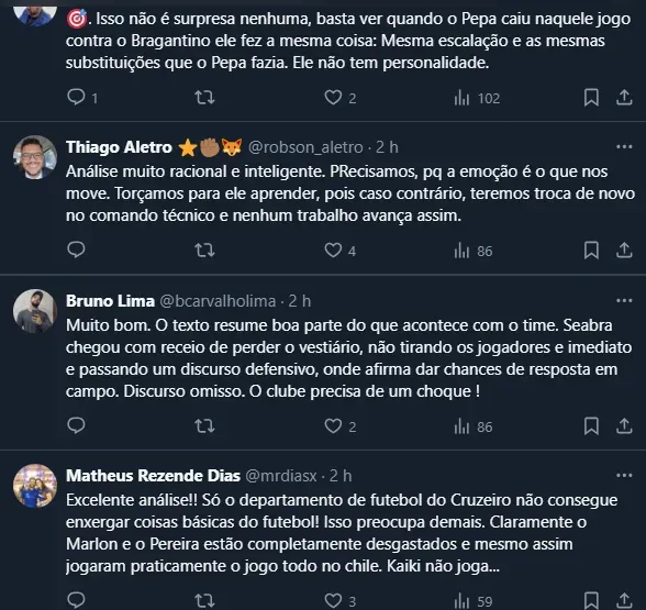 Vale lembrar que, além do desempenho instável na Sul-Americana e da derrota na final do estadual, o Cruzeiro já havia sido eliminado na primeira fase da Copa do Brasil diante do Sousa, da Paraíba.