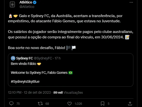 Fábio Gomes já arrumou as malas e está deixando a cidade de Belo Horizonte para ser anunciado no próximo desafio da carreira. Vale lembrar que a saída de Diego Costa acabou sendo reposta pelo atleta, que passou por empréstimo pelo Vasco, Paços Ferreira, Juventude e agora no futebol australiano.