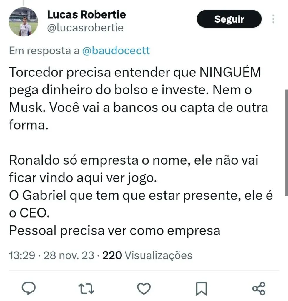 Vale recordar que o Cruzeiro foi transformado em SAF oficialmente em abril do ano passado e havia a expectativa de controle das dívidas e investimento no Clube. Mas a expectativa de que este investimento pudesse aumentar ao longo dos anos pode ser frustrada.