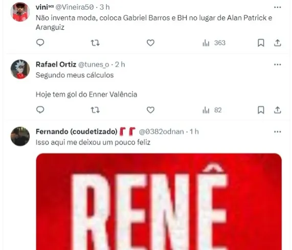 Uma das boas notícias é que Eduardo Coudet tem a sua disposição Enner Valencia, Renê e Johnny, que se já recuperaram de lesão. Por outro lado, Campanharo, Keiller, Lucca, Pedro Henrique e Vitão são os pendurados.