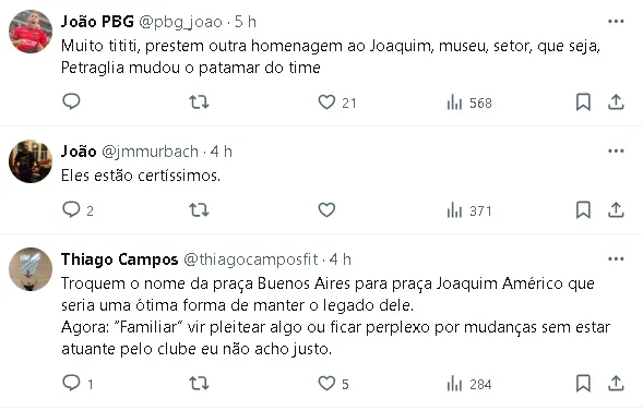 “Claro que nossa família recebe essa notícia com indignação. Você não presta uma homenagem a alguém ‘desomenageando’ outro, ou passando por cima da história ou mudando a história. Nós ficamos surpresos e perplexos. Você faz uma homenagem justa ao Mario Celso Petraglia de outra forma, não mudando o nome do estádio“, disse Carlos Eduardo de Athayde Guimarães, bisneto de Joaquim Américo e torcedor do Athletico.