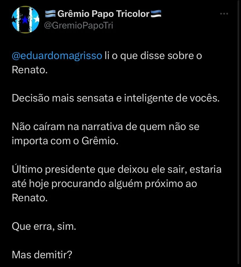O vice-presidente também expressou total confiança no trabalho de Renato Portaluppi à frente da equipe. “Ainda não concluímos o trabalho de 2023, mas não vejo razão alguma para que o Renato não seja o técnico em 2024. Não estou garantindo a permanência dele, já que ele pode ser assediado por outros clubes. Mas temos convicção nele”, completou.