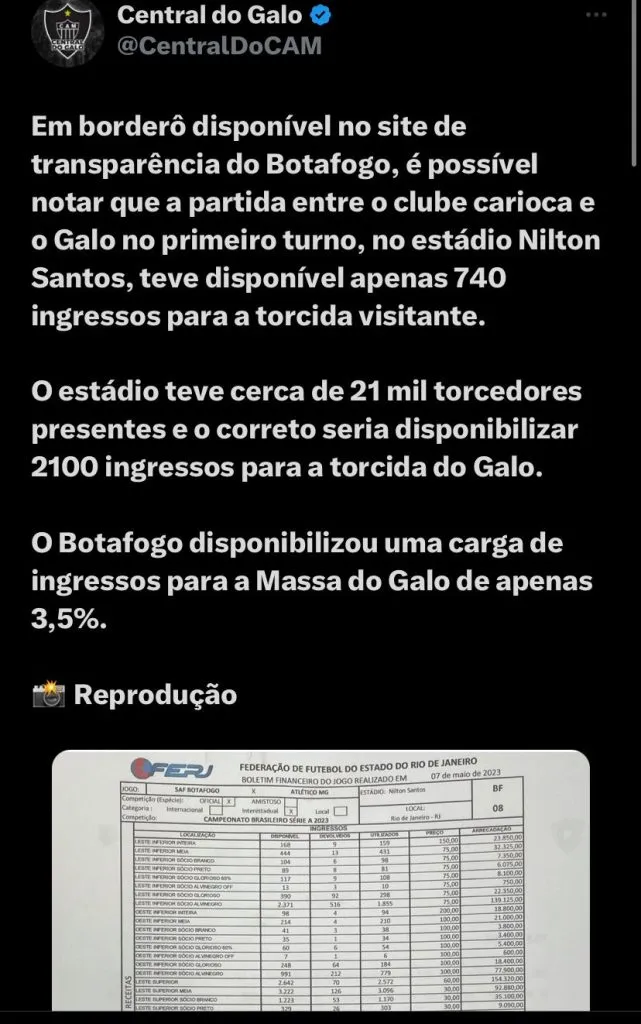 [SIC] “O Botafogo solicita e aguarda explicações do Atlético Mineiro sobre o porquê da carga reduzida comercializada para a sua torcida no jogo deste sábado (16), na Arena MRV, pelo Brasileiro. O Clube formalizou o pedido de 10% dentro prazo previsto no regulamento da competição e espera que as regras sejam cumpridas por respeito a todos os envolvidos. O Botafogo defende uma política nacional de reciprocidade, condições e tratamentos aos visitantes de todos os clubes para evolução do futebol brasileiro. O Clube reitera o seu inconformismo com a situação e aguarda posicionamento”, disse a postagem.