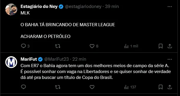 A torcida do Bahia está animada com os reforços para a temporada de 2024. A equipe almeja disputar por títulos, não passar pelo mesmo sufoco de 2023, onde quase caiu para a 2ª divisão do futebol nacional.