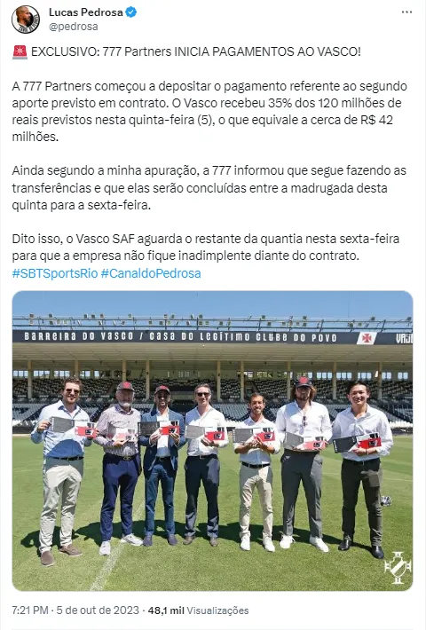 “O Vasco recebeu um adiantamento de 16 milhões de reais para fazer a janela de transferências do meio do ano. A conta atual do aporte que a 777 fez e ainda tem a fazer, segundo apurei, é a seguinte: R$ 120M + correção e juros = 126 milhões de reais. Com os R$ 16 milhões adiantados, a 777, nesta quinta, 5 de outubro, realizou o pagamento de 35% em cima de 110 milhões de reais, totalizando algo em torno de R$ 38.5M”, informou Lucas Pedrosa.