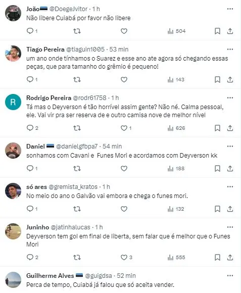 Renato, que está em compasso de espera sobre sua renovação, algo que está bem encaminhado, aprova a contratação de Deyverson. Todavia, o Tricolor negocia com o Cuiabá uma transferência por empréstimo, de acordo com publicação do perfil Soccer News Grêmio.