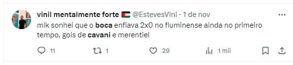 A partida entre Fluminense e Boca Juniors acontece no Maracanã, às 17h (de Brasília). O Bolavip Brasil transmitirá o jogo AO VIVO a partir das 16h30. O Boca deve atuar com: Sergio Romero; Advíncula, Figal, Valentini, Fabra; Medina, Pol Fernández, Equi Fernández, Barco; Merentiel e Cavani.