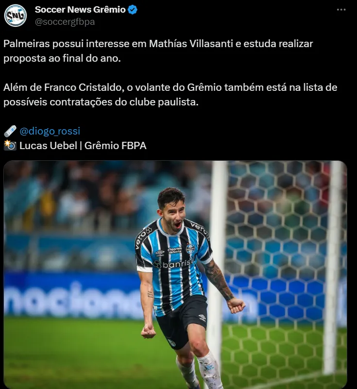 Além disso, ainda há a grande dúvida de quem será o substituto de Suaréz no ataque. Porém, enquanto isso não se resolve, outras situações são discutidas na Arena. Alguns nomes podem deixar a equipe de Renato Portaluppi, com diversos rumores surgindo no mercado. Agora, o Palmeiras estaria analisando a situação de Villasanti para 2024. Portanto, a direção estaria oferecendo uma renovação para o jogador. Os números envolvidos no negócio vazaram.