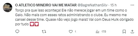 Em um momento de fúria, Hulk admitiu a real possibilidade de deixar o Atlético-MG no fim do ano: “É uma falta de respeito, eu estou cansado, do Brasil eu tô cansado. Mais um mês aqui e eu vou embora”.