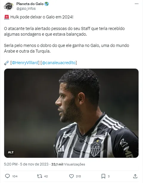 Mesmo assim, não tem como ignorar o fato que alguns mercados de fora do Brasil já se atraíram pelo futebol de Hulk ainda em 2023. Apesar do esclarecimento, que deve ficar no Galo na próxima temporada, o atacante pode ser procurado novamente pela Turquia.