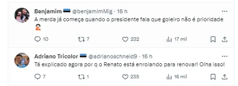 “A merda já começa quando o presidente fala que goleiro não é prioridade”. “Tá explicado agora porque o Renato está enrolando para renovar! Olha isso!”. “Não é prioridade? Se emocionaram com 2 jogos do Caíque?”, cobraram os gremistas.