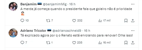 Isso revoltou muitos torcedores tricolores, que usaram as redes sociais para mostrarem toda sua insatisfação com a decisão do Clube. Para eles, o planejamento da equipe deveria, sim, ter a contratação de um grande nome para o gol.
