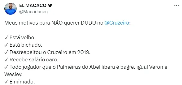 Do mesmo jeito que alguns torcedores repudiam a volta, outros gostariam de ver o ‘baixola’ jogando novamente. Em uma publicação sobre o assunto, um torcedor comentou: “Dito isso, vem Dudu”.