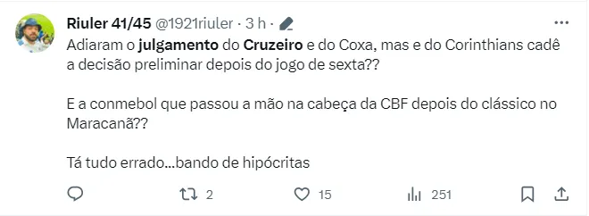 O julgamento de Coritiba e Cruzeiro devido à invasão das torcidas e briga generalizada no duelo entre os times no Estádio Durival de Britto, foi adiado e acontecerá no dia 4 de dezembro.