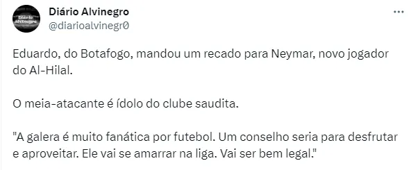 Um dos jogadores que vem se destacando neste Brasileirão é o meio-campista Eduardo. O atleta foi decisivo para o Time de General Severiano em diversas partidas na competição nacional. Ele, inclusive, acabou mandando um recado para nada mais, nada menos, que Neymar. Isso porque o astro foi contratado pela equipe em que ele é considerado ídolo: o Al-Hilal, da Arábia Saudita.