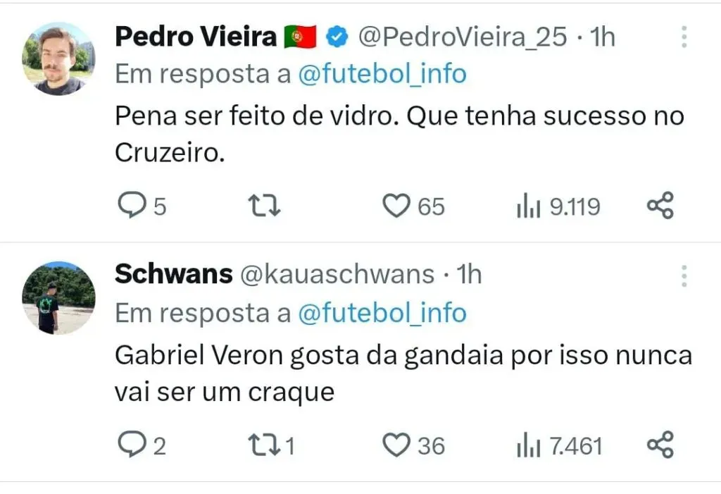 O novo reforço do Cruzeiro foi elogiado por seu antigo treinador, Sérgio Conceição, comandante do Porto. O técnico exaltou a qualidade do jogador de 21 anos, que chega na Raposa com vínculo até o final de 2024, para substituir Bruno Rodrigues, contratado pelo Palmeiras.