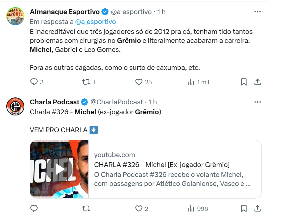 No fim de 2023, em entrevista à Rádio Gaúcha, o próprio meio-campista ‘descascou’ para cima dos médicos do Grêmio que o operaram ao longo do caminho. Para Michel, o melhor seria não ter feito o procedimento para retirar o menisco, ainda em 2017.