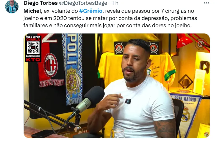 Em entrevista ao Charla Podcast, Michel, ex-volante campeão da Libertadores com o Grêmio em 2017, falou que por conta de depressão, problemas familiares e não conseguir mais jogar futebol, devido a fortes dores depois de várias cirurgias no joelho,… pic.twitter.com/M2rRoMy7kx