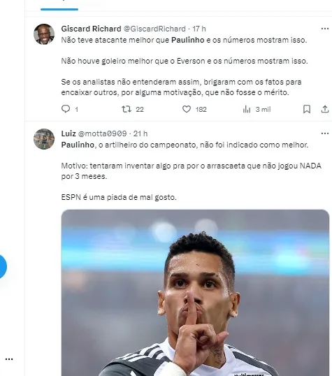 Além disso, Paulinho foi o destaque do Galo no Brasileirão, com o total de 20 gols somados. Ele que desembarcou em BH em busca do protagonismo acabou se encontrando após passagem ‘apagada’ na Europa.