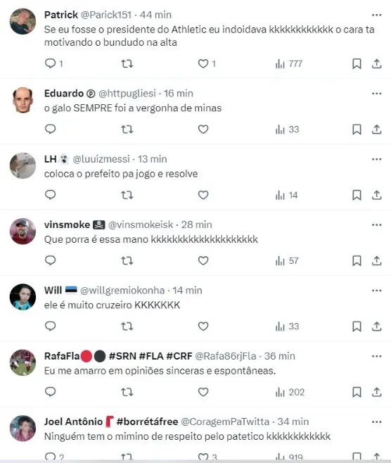 “O Athletic tem que meter ao menos quatro gols no Galo. O Galo com o Hulk, aquela b* gorda que não faz nada. O time do Galo não vale nada! É a vergonha de Minas“, disse o prefeito.