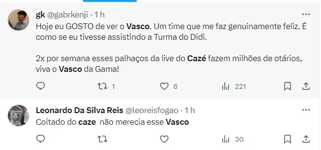 Inconformado com o rumo do jogo, Casimiro, o Cazé, foi até a internet e disparou: “Salve, rapaziada. Tudo certo? Obviamente que não, o Vasco não permite que nada esteja certo. (…) É bom que eu não faça live hoje, porque senão eu ia enfartar”.