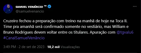 De acordo com o jornalista Samuel Venâncio, que trouxe a informação do setorista Thiago Valu, por mais que Seabra só vá definir o 11 inicial no vestiário, a tendência é que William e Bruno Rodrigues voltem ao time titular. Vale frisar que, apesar de ser o artilheiro do time na temporada, Bruno Rodrigues viveu um período de indefinição sobre a permanência e sentiu o reflexo dentro de campo. Agora, diante do Massa Bruta, pode voltar a brilhar com a camisa azul.
