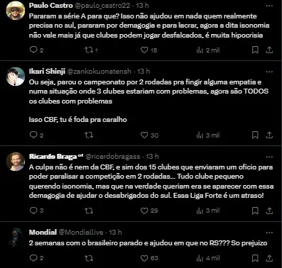 “Outro ponto importante foi que a CBF prometeu estudar uma ajuda financeira para ajudar os clubes do Rio Grande do Sul”, confirmou a apuração do colega, reforçando esse auxílio da organização que gere o futebol brasileiro.