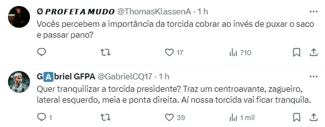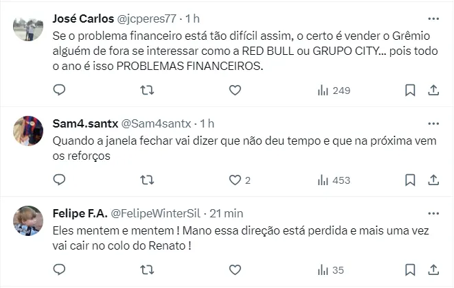 Além do mais, o dirigente expressou seu desejo de ver os jovens jogando: “Eu gostaria de ver esses jogadores atuando, é um ano importante, temos quatro competições, precisamos de um elenco mais numeroso, mais qualificado, com mais de uma opção por posição. E isso passa pela manutenção deles”, concluiu o presidente do Grêmio.