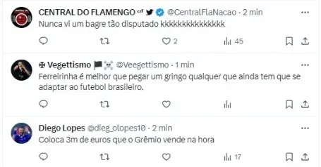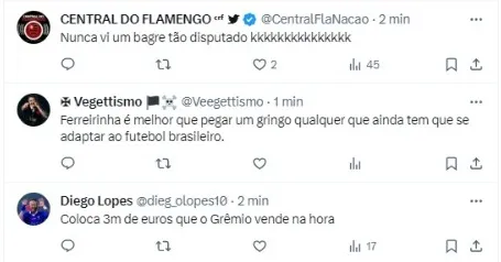 No caso do Grêmio, uma possibilidade, no entanto, gera uma ‘novela’: Bahia e São Paulo estão lutando pela contratação de Ferreirinha, oferecendo 1,5 milhão de euros (R$ 8 milhões) pelos 35% que tem direito.