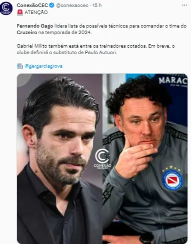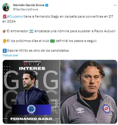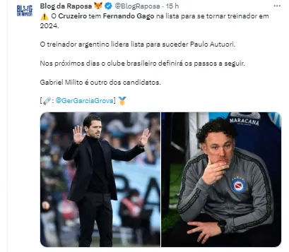“Cruzeiro tem Fernando Gago como nome para se tornar treinador em 2024. O técnico argentino encabeça lista para suceder Paulo Autuori”, informou o jornalista em publicação nas suas redes sociais.