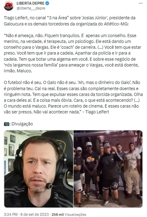 “O futebol não é seu. O Galo não é seu. ‘Ah, mas o dinheiro do Galo’. Não é problema teu. Cai na real. Esses caras são completamente doentes e ninguém nota. Tem que expulsar esses caras da torcida organizada. Olha a cara deles aí. É a coisa mais óbvia. Cara, o que está acontecendo? (…) O mundo está maluco. Parece um roteiro de cinema. E esses caras não vão ser presos. Não vai acontecer nada”, complementa o comentarista.