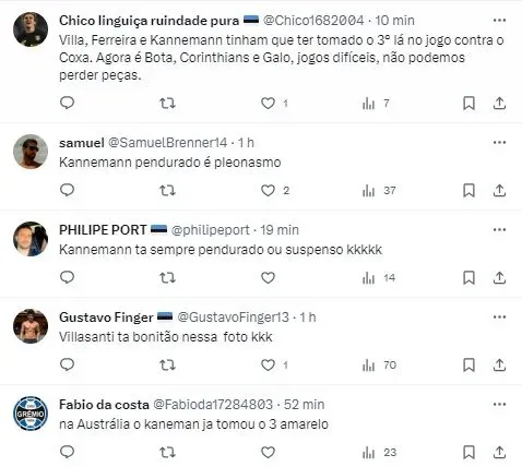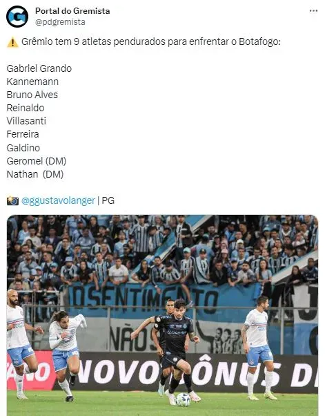 Praticamente todos os setores contam com jogadores que podem ficar de fora no duelo seguinte ao confronto com o Botafogo. As principais preocupações são o zagueiro Kannemann e o meio-campista Villasanti. As informações são do Portal do Gremista.