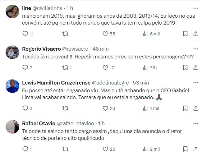 “O Cruzeiro anuncia Robson Pires como o novo Diretor Institucional do time. O profissional tem experiência no futebol e trabalhou no clube celeste entre 2003 e 2019. Seja bem-vindo de volta, Robson!”, escreveu.