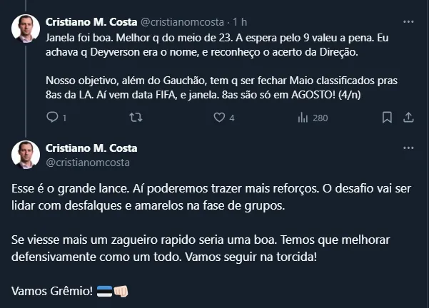 Em 24 jogos na atual temporada, o atacante marcou 11 gols e colaborou com outras três assistências. Por fim, o próximo compromisso do Grêmio na temporada será no sábado (9), em casa, contra o Brasil de Pelotas.