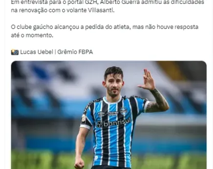 Bittar ainda trouxe bastidores sobre a renovação de contrato entre Villasanti e o Grêmio. Vale destacar que o volante paraguaio só tem contrato com o Imortal até o fim da próxima temporada, ou seja, poderia assinar um pré-contrato no meio do ano que vem e deixar o time de graça no fim de 2024.