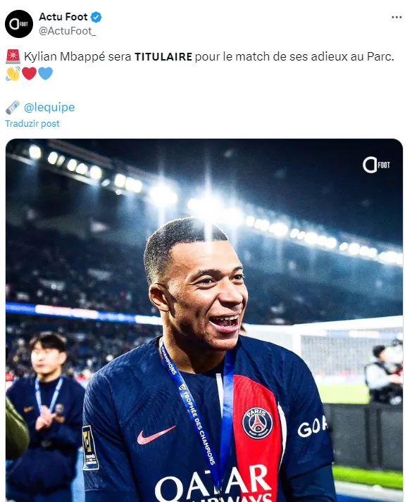 Campeão francês por antecipação, Mbappé se despedirá em breve, tendo apenas mais quatro jogos pelo PSG. “Já sabíamos há algum tempo, acho que todo mundo já sabia (que Mbappé iria sair). Foi apenas tornado público agora”, disse.