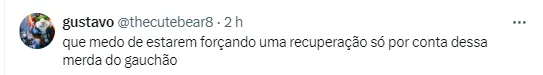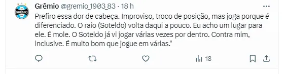 “Estava olhando as imagens do treino de ontem do Grêmio. Soteldo correu de chuteira. Do tempo que acompanho treinos, o fato de trabalhar de chuteiras sempre significou avanço na recuperação. Foi bom ver e saber isso”, disse em seu Twitter oficial.