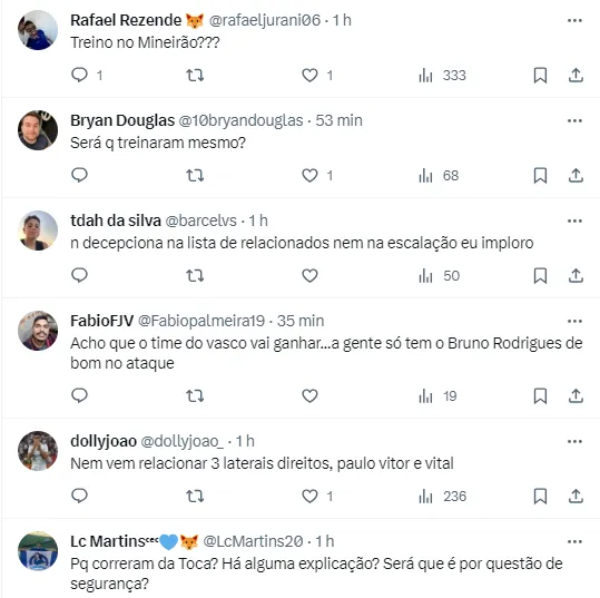 “Só vençam, único pedido que tenho. Bora pra cima!”, comentou outro torcedor. “Não decepciona”, ressaltou outro torcedor do Cruzeiro nas redes sociais do time.