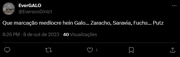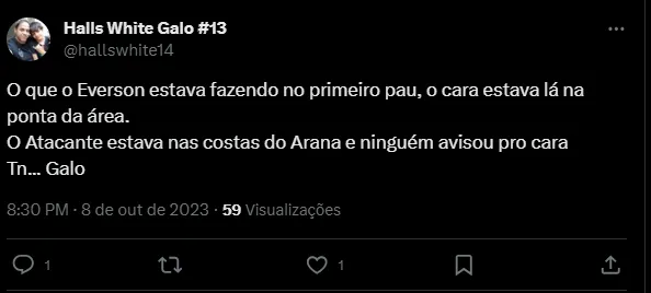 “Que marcação medíocre hein Galo… Zaracho, Saravia, Fuchs… Putz”, “O Everson pulou, não conseguiu defender e ainda arrancou um pedaço do gramado KKKKKKKKKK”, “Minha opinião. Agora é só pegar o vídeo do gol e ver onde o Goleiro estava posicionado. As falhas foram gerais. Saraiva, Zaracho, Fucks. E também do Everson. Que se posiciona mal nas bolas cruzadas”, disseram os torcedores.