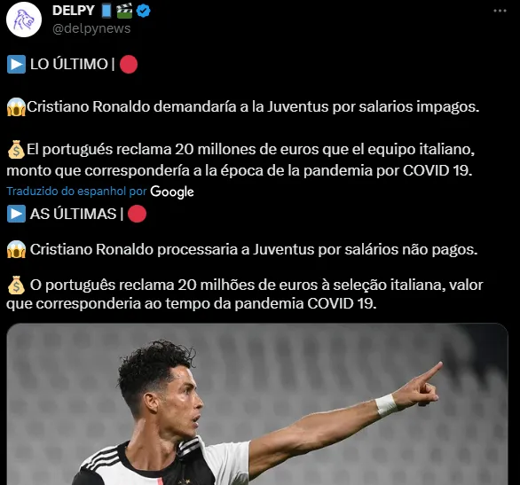 No entanto, outro clube da vitoriosa carreira de Cristiano Ronaldo apareceu de surpresa nas notícias. Trata-se da Juventus. De acordo com o jornal Gazzetta dello Sport, o português tenta receber 19,9 milhões de euros (R$ 103,29 milhões, na cotação atual) da Velha Senhora. O caso segue no tribunal italiano.
