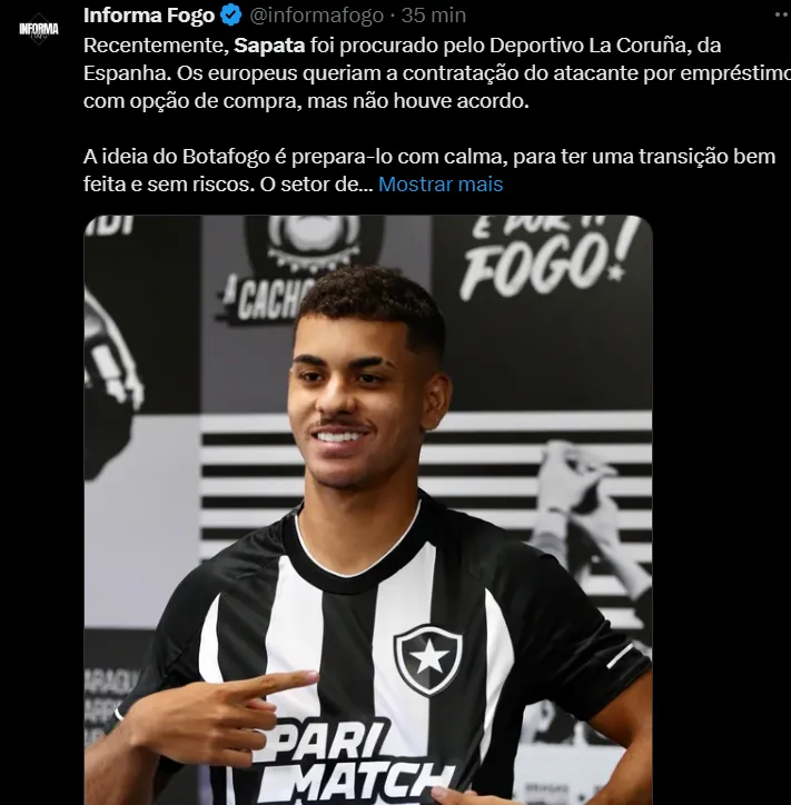 No entanto, John Textor já deixou claro que não pretende negociar o jovem. A ideia do Fogão é fazer um processo de transição calmo, para que ele consiga se consolidar no profissional. Além disso, o respeitado setor de ánalise e prospecção dos cariocas gosta muito da promessa.