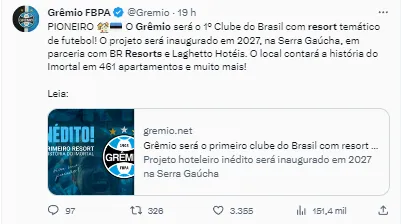 De acordo com informações trazidas pelo jornalista Marinho Saldanha, do site Uol Esporte, o Grêmio fechou um acordo histórico e pioneiro no Brasil. O Tricolor Gaúcho será um dos primeiros times brasileiros a ter um restort temático. O negócio gerará lucros para o Clube que poderá arrecadar valores através do acordo com a exploração da marca.