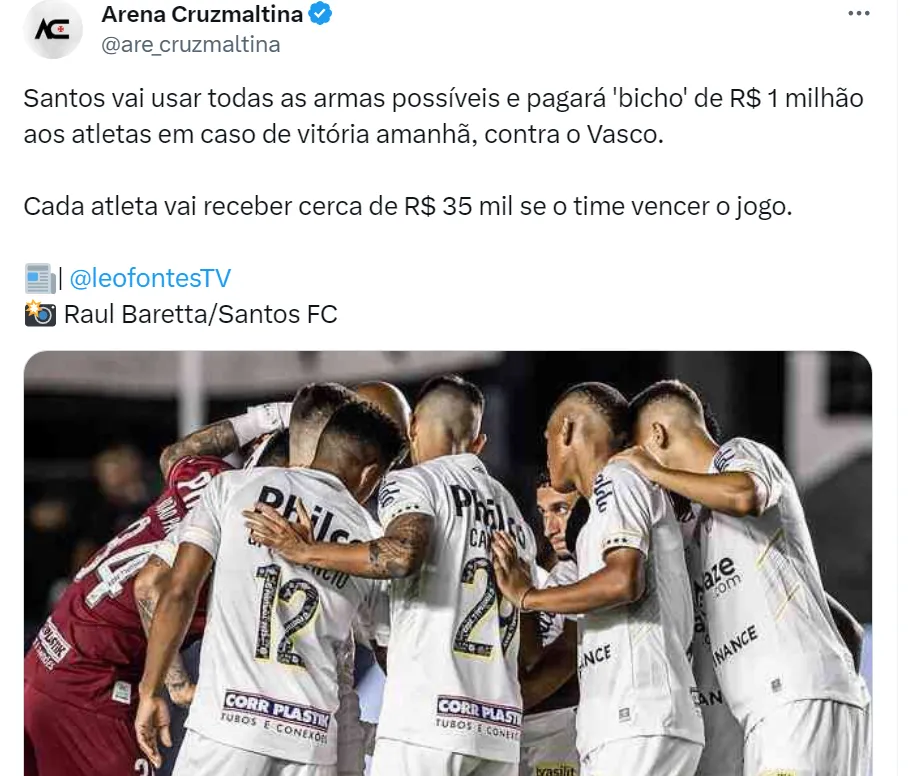 Já neste sábado (30), o Clube Paulista marcou um treino aberto na Vila Belmiro aberto ao público e, por fim, o presidente Andrés Rueda tomou uma atitude surpreendente e está prometendo bicho de R$ 1 milhão aos jogadores em caso de vitória contra o Gigante da Colina, segundo informou o jornalista Leo Fontes. Os torcedores do Vasco estão afirmando que bateu o desespero no Alvinegro Praiano.