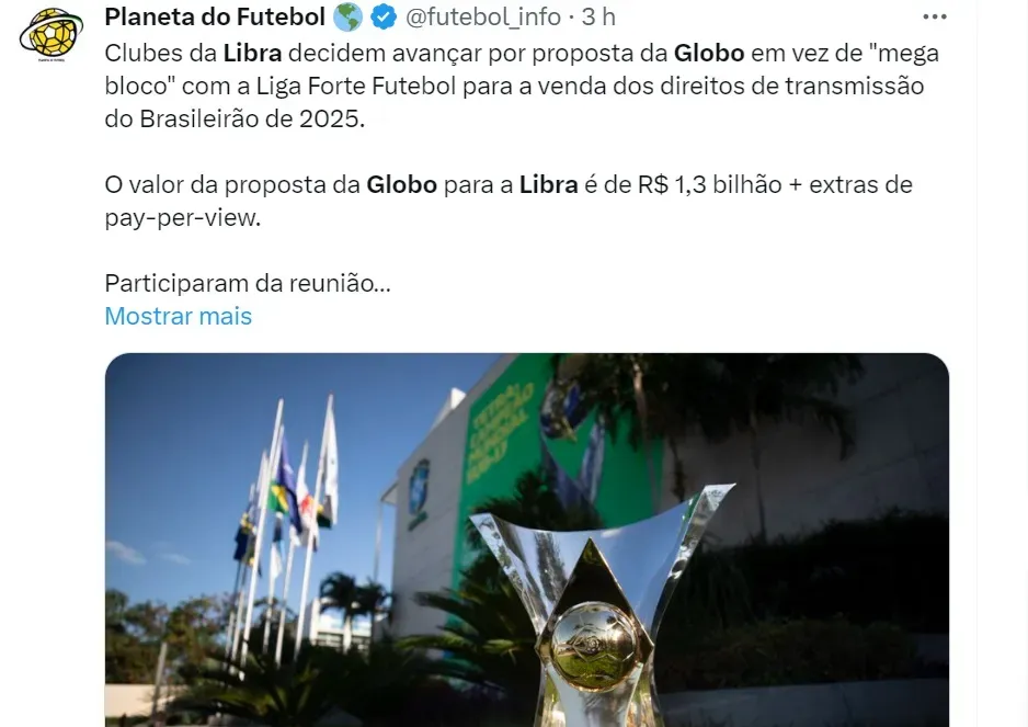 Nesta quarta (7), o Grêmio ganhou uma ótima notícia no que diz respeito a investimento. Os clubes da Libra aceitaram dar seguimento à negociação dos direitos de transmissão da Série A do Campeonato Brasileiro (ciclo de 2025 a 2029) com a TV Globo.