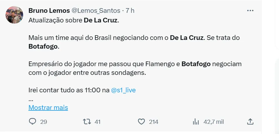 Segundo o representante, o River Plate segue fazendo jogo duro para negociar De La Cruz, porque a multa rescisória estipulada estaria na casa dos US$ 20 milhões (cerca de R$ 100 milhões na cotação atual). O contrato do meia uruguaio – irmão de Carlos Sánchez – expira em dezembro de 2025 em Buenos Aires.