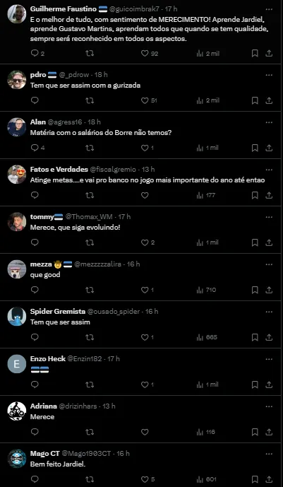 “O Grupo City avisou aos agentes do atleta de 18 anos que, assim que abrir a janela europeia, a direção gremista receberá uma proposta de 20 milhões de euros (cerca de R$ 100 milhões na cotação atual). O clube tem 70% dos direitos econômicos do jogador”, informou Cesar Cidade Dias.