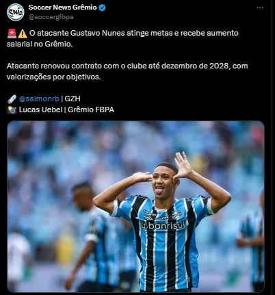 Vale destacar que o Grêmio se blindou e pode negociar os valores pela joia com tranquilidade, pois o contrato do atacante é longo. Ele tem contrato com o time até o final de 2028.
