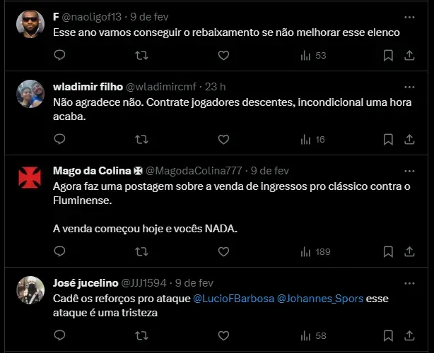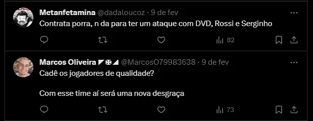 Nas redes sociais, a torcida não entende o valor investido para um time que quase não mudou em relação à temporada passada. Isso também soma com o desempenho abaixo de alguns jogadores, incluindo Vegetti.